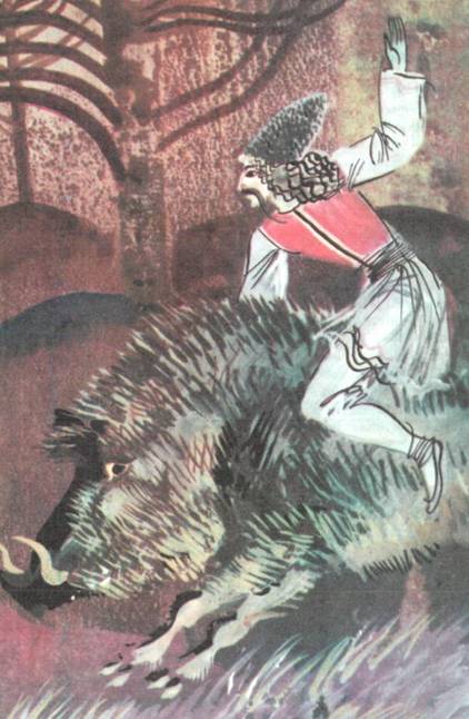 Солнце как раз подходило к полудню, в лесу раздалось громкое хрюканье, и стали выходить кабаны в грязи поваляться. Высмотрел себе Базилик славного кабанчика, вскочил ему на спину, оседлал — и давай бог ноги. Как схватятся кабаны и ну за ним гнаться — поймать норовят, землю едят. Не будь у БазиликаФэт-Фрумоса коня такого резвого, пришлось бы ему здесь костьми лечь: подхватил он кабана, на коня его закинул и сам в седло вскочил. Теперь конь под ними играл, сам Базилик Фэт-Фрумос песни напевал, радовался, что и это дело довел до благополучного конца.